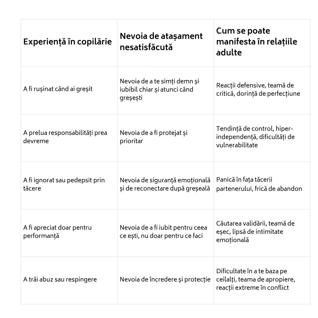 Când aceste nevoi nu sunt satisfăcute, ele nu dispar — ci se transformă în tipare de protecție și durere care se reactivează în iubirile noastre mature.