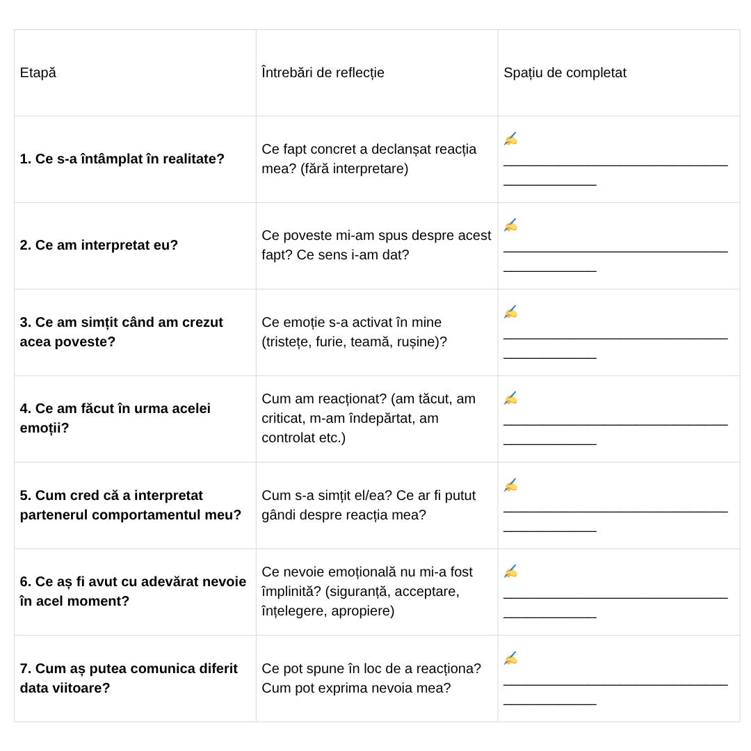 După ce ai completat, schimbă perspectivele cu partenerul tău — ascultă-l cu inima, fără a corecta, fără a judeca.